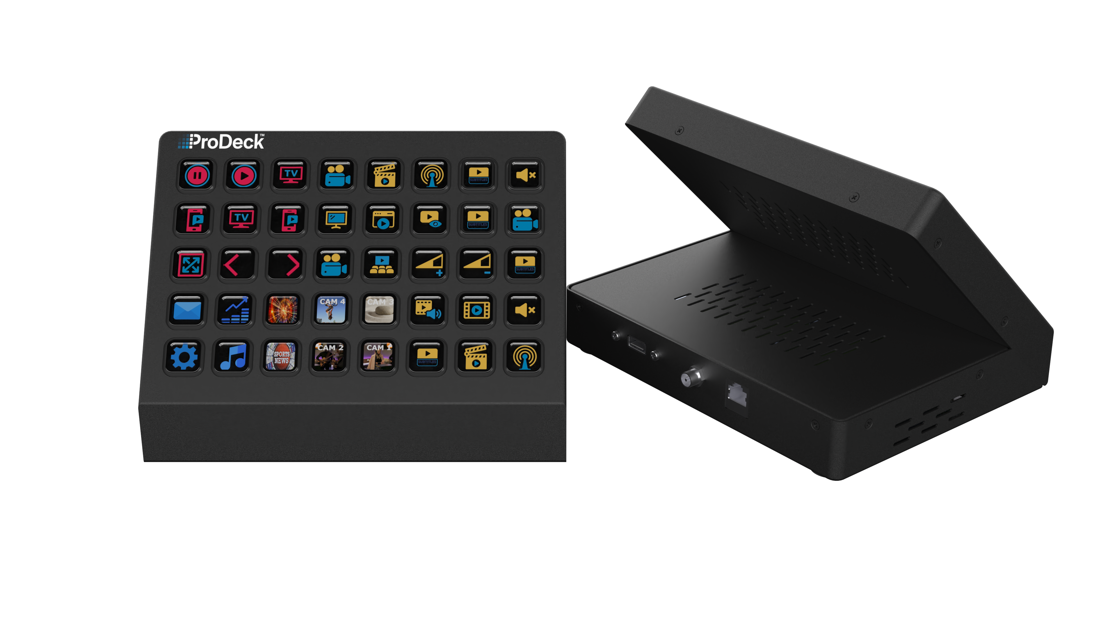 ProDeckはスタンドアロンのコンピュータユニットとして、USBポートを介してStreamdeckなどの他のデバイスに接続して併用することができます。StreamdeckまたはUSB入力に接続するサードパーティ製ハードウェアの電源要件にご注意ください。ProDeckはUSB 2.0対応のUSB Bタイプポートを備えています。